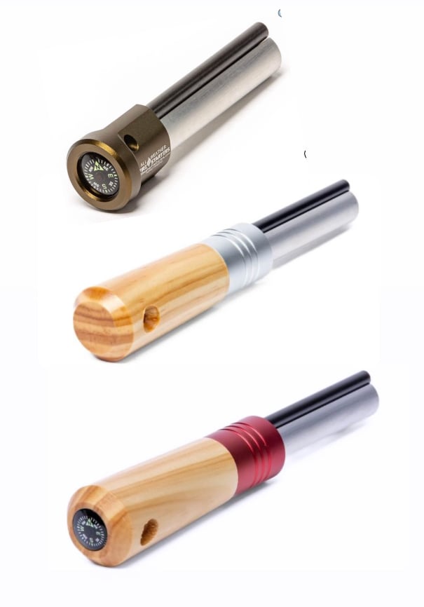 LIFETIME MAGNESIUM REPLACEMENT on the Navigator 2, Explorer 2 and the Scout. This all-weather firestarter is the cornerstone of Gary’s survival in the wilderness. With a hand-crafted wooden handle and a generous amount of magnesium for lighting, which not only makes it easy to start fires, but can be used as a signal, illumination, and to scare predators in a pinch. The flint’s paracord tether can also be used for any emergency rope/cording applications. Various sizes and optional compass are available as well.